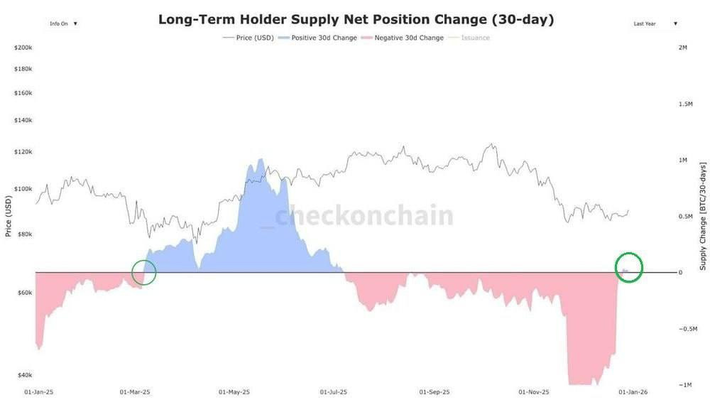 For the first time in nearly six months, long-term Bitcoin holders have ceased net selling, signaling a shift in market structure from distribution to absorption. Recent downside pressure has come primarily from short-term holders and leveraged positions rather than conviction sellers, a pattern that historically aligns with late-stage capitulation rather than market tops. With ETFs and corporate treasuries steadily absorbing supply, reduced sell pressure from long-term holders means even modest incremental demand can have an outsized impact on price as the market transitions into a consolidation-and-accumulation phase.